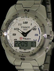 Tissot T-Touch "Expert" 100m water resistant, stainless steel case and band. Altimeter, barometer,compass, 2 alarms, dual time, stopwatch, countdown timer,thermometer. Sapphire crystal, silver color dial with Arabic numbers.
