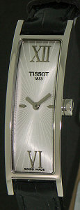 Tissot Happy Chic Collection. Steel polished watch with quartz watch for ladies. Shiny textured silver color dial with large Roman numerals. Black leather watch strap.