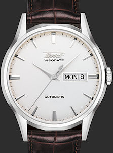 Tissot Heritage Visodate model T019.430.16.031.01. Swiss Automatic ETA movement with day/date. Stainless steel case. Sapphire crystal. Silver color dial with index markers. Brown leather band.