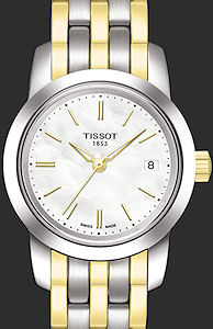 Tissot T033.210.33.111.00 Classic Dream Lady quartz watch. White Mother-of-Pearl dial with date. Very classic look. Round steel case, sapphire crystal, steel bracelet with gold plated accents. Powered by Swiss ETA quartz movement