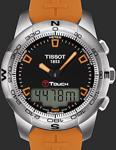 Tissot T-Touch II Multi-Function wrist watch. Stainless steel case, sapphire crystal, black dial with orange hands and markers. Orange rubber band. Watch functions activated by pressing on the crown plus touch-sensitive screen. T-Touch functions: Altimeter, Chronograph, Compass, Alarm, Thermometer, Barometer, Date and Time.