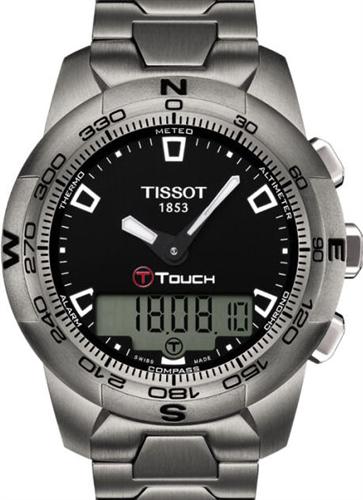Tissot T-Touch Multi-Function wrist watch. Titanium case and bracelet, sapphire crystal, black dial with luminous hands and markers. Watch functions activated by pressing on the crown plus touch-sensitive screen. T-Touch functions: Altimeter, Chronograph, Compass, Alarm, Thermometer, Barometer, Date and Time.