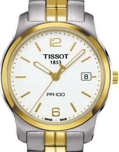 Tissot T049.410.22.017.00 Classic PR100 Steel Mens quartz watch. White color dial with date. Round steel case with gold tone accents, sapphire crystal, steel bracelet with gold tone accents. Powered by Swiss ETA quartz movement