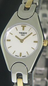 Tissot Cocktail T05.2.255.81 quartz watch from the Belle Collection. Swiss ETA quartz movement. This elegant little watch has a gorgeous mother of pearl dial with gold color hands and markers. Perfect with either white or yellow jewelry, it has alternating stainless steel and gold electroplated links.