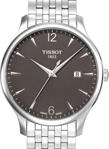 Tissot T063.610.11.067.00 Tradition Gent quartz watch. Grey color dial with date. Round stainless steel case, sapphire crystal, steel bracelet. Powered by Swiss ETA quartz movement