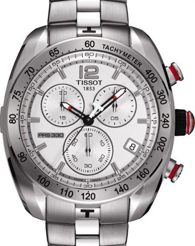 Tissot PRS330 T076.417.11.037.00 chronograph quartz watch. Stainless steel case. Silver color dial with date, luminous filled hands and markers. Sapphire crystal. Steel bracelet.