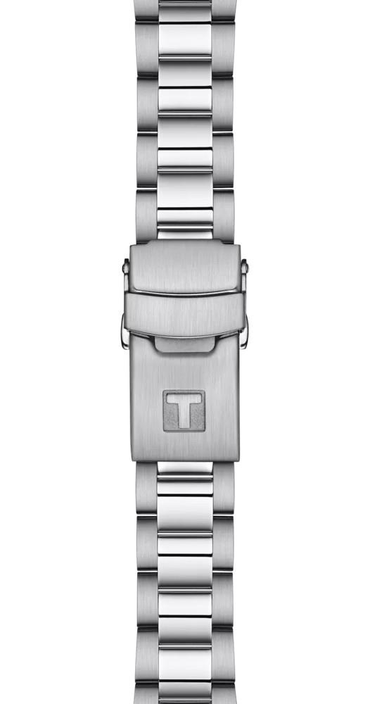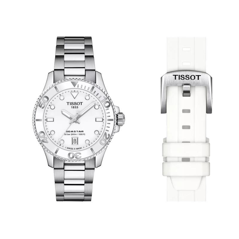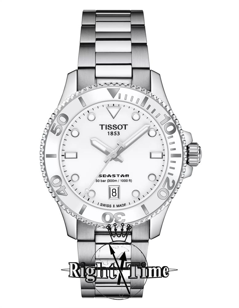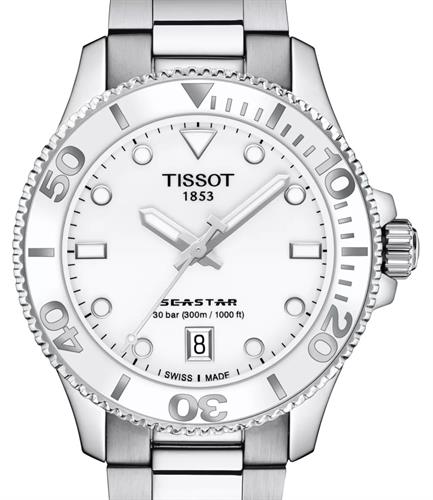 Tissot Seastar 1000 model T120.210.11.011.00. Swiss made quartz analog movement. Solid stainless steel case and bracelet with uni-directional 60 minute bezel. White dial with luminous hands and markers. Sapphire crystal. Water resistant to 30bar.