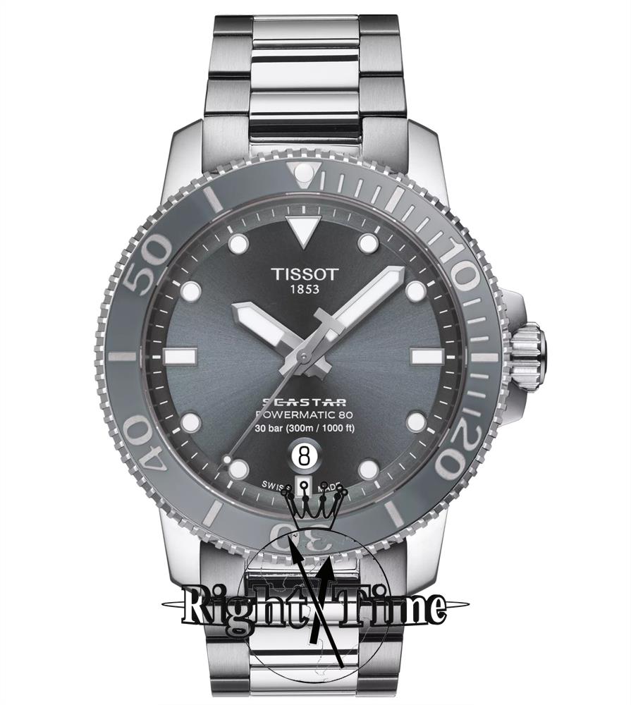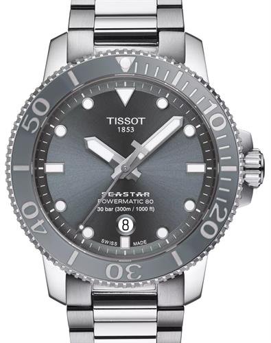 Tissot Seastar 1000 model T120.407.11.081.01. Swiss made Tissot Powermatic 80 automatic movement. Solid stainless steel case and bracelet. Uni-directional 60 minute bezel with grey ceramic insert. Grey dial with steel tone luminous hands and markers. Sapphire crystal. Water resistant to 30bar.