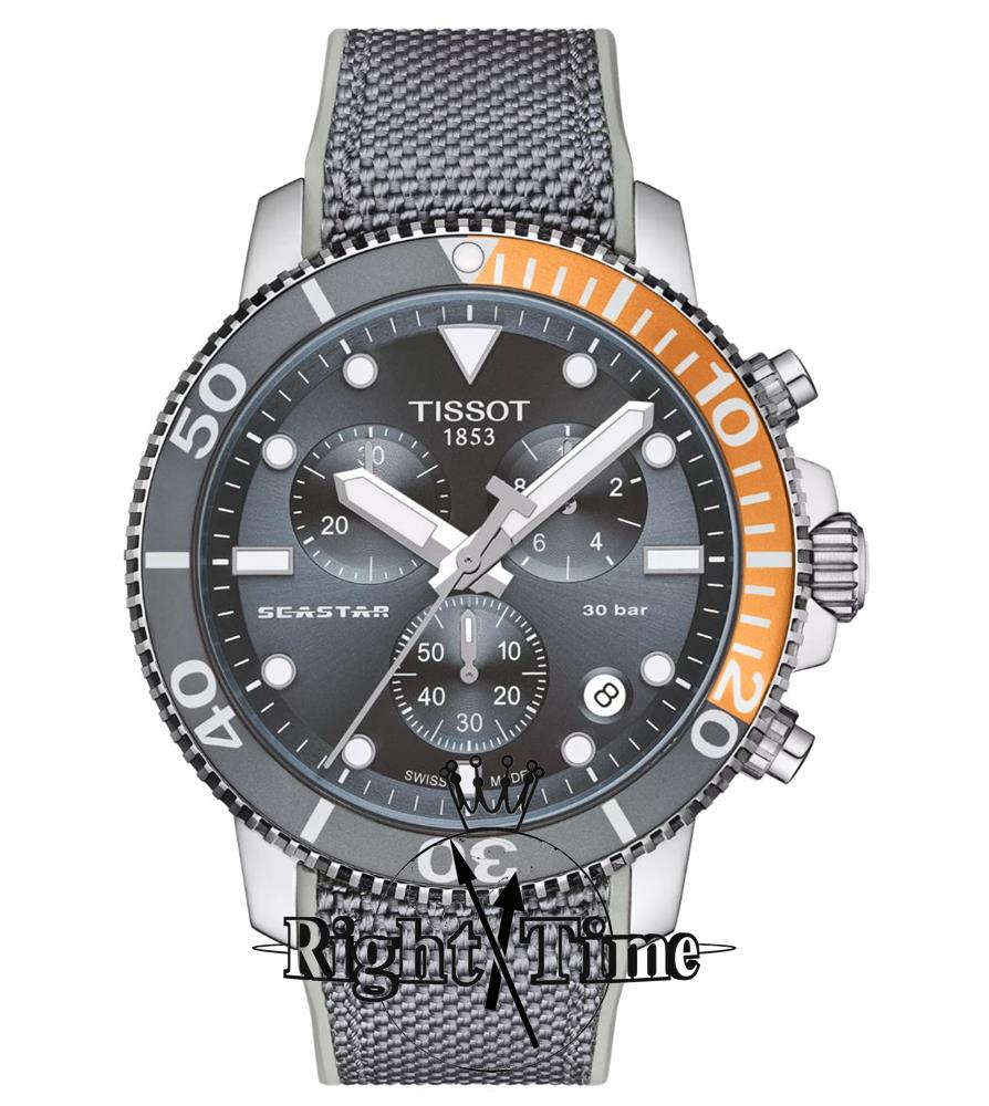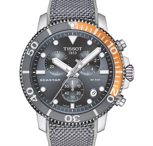 Tissot Seastar 1000 Chronograph model T120.417.17.081.01. Swiss made quartz analog chronograph movement. Solid stainless steel case with a uni-directional 60 minute bezel and grey silicone strap. Grey dial with steel tone luminous hands and markers. Sapphire crystal. Water resistant to 30bar.