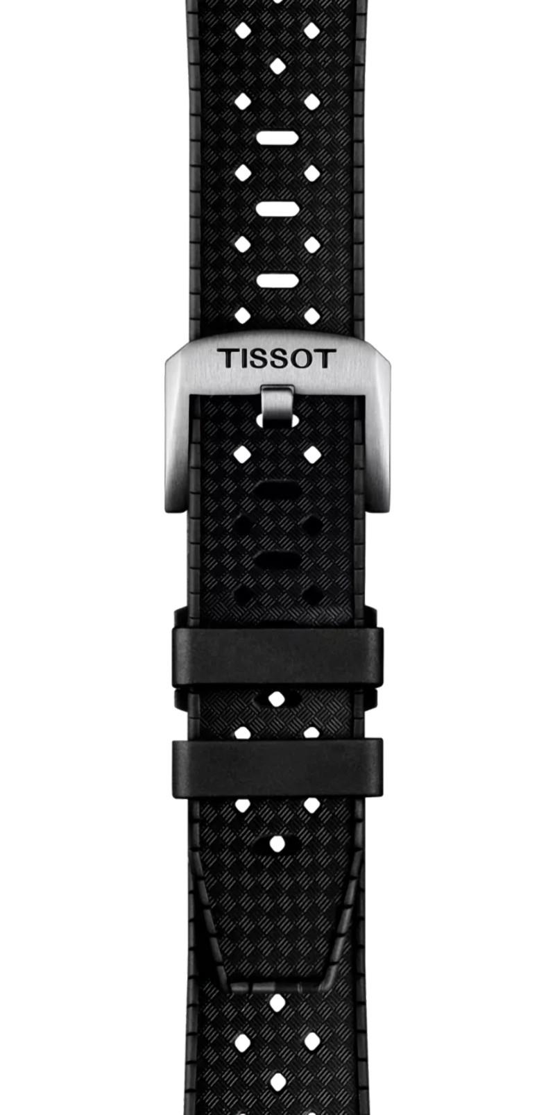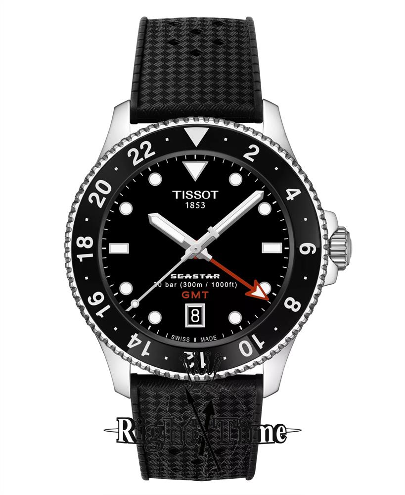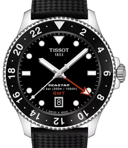 Tissot Seastar 1000 model T120.852.17.051.00. Swiss made quartz analog movement with GMT second time zone function. Solid stainless steel case with a bi-directional 24 hour black bezel. Black dial with steel tone luminous hands and markers. Black genuine rubber strap. Sapphire crystal. Water resistant to 30bar.