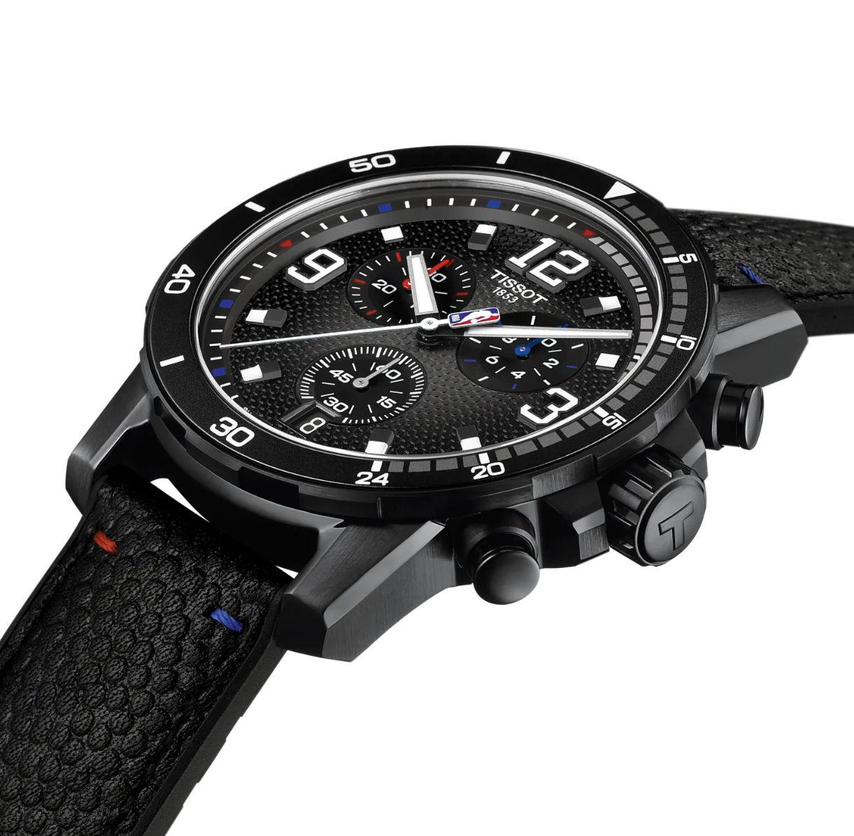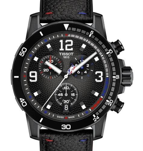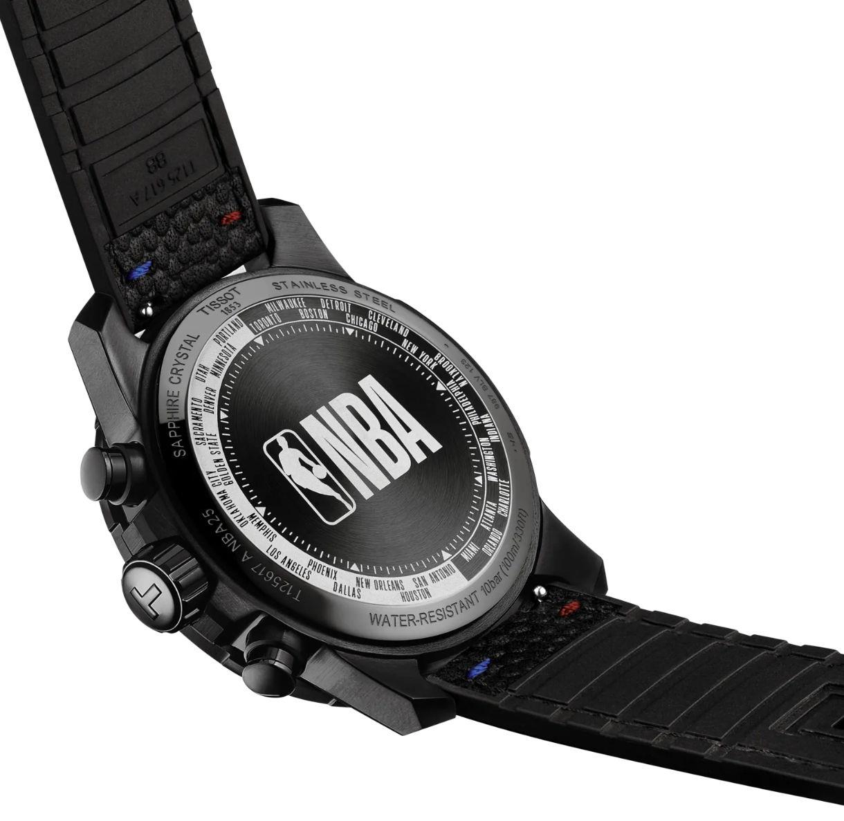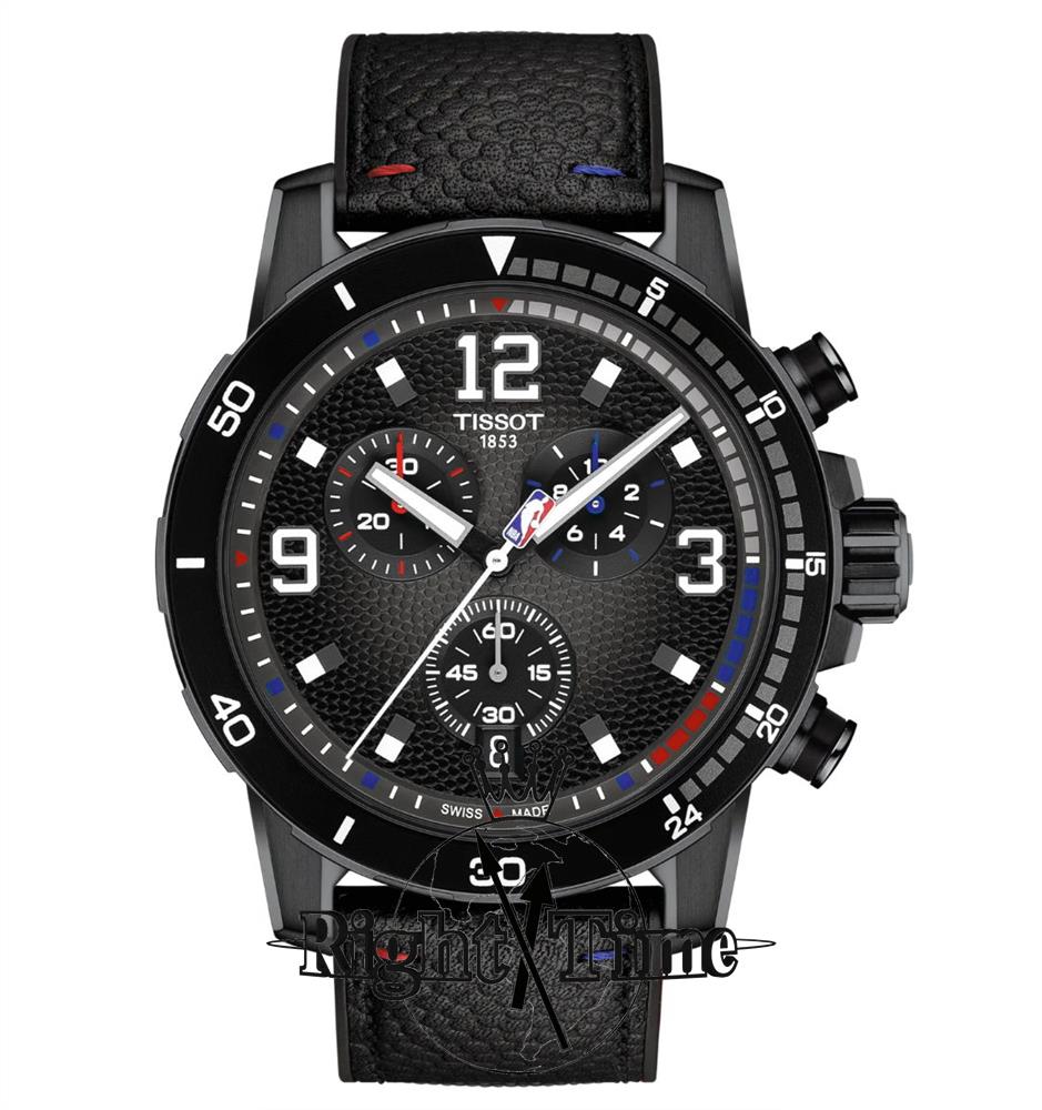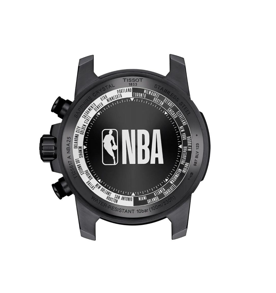 Tissot Supersport NBA Special Edition model T125.617.37.067.00. Black PVD coated 45.5mm stainless steel case. Dial features basketball dot pattern and a gradient fade from dark grey to black at the edges which creates an illusion of depth that mirrors the shape of the ball. Numeral indexes echo those on player`s jersey. NBA logo on the second hand serves as a further tribute to the sport. Black leather and synthetic strap making it perfect for everyday wear and physical activities. Case back engraved with the NBA logo, surrounded by the cities and states the teams take their names from, both the Western and Eastern Conferences. Watch is powered by quartz chronograph movement.