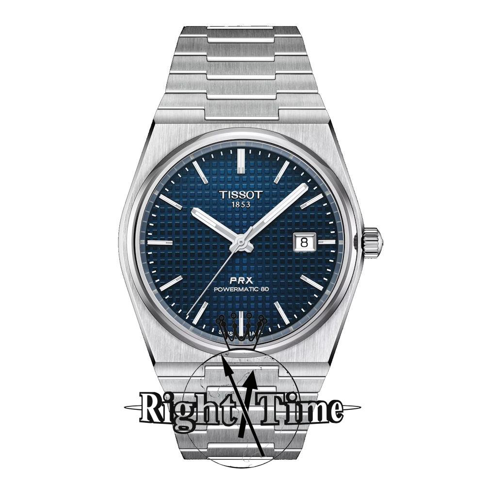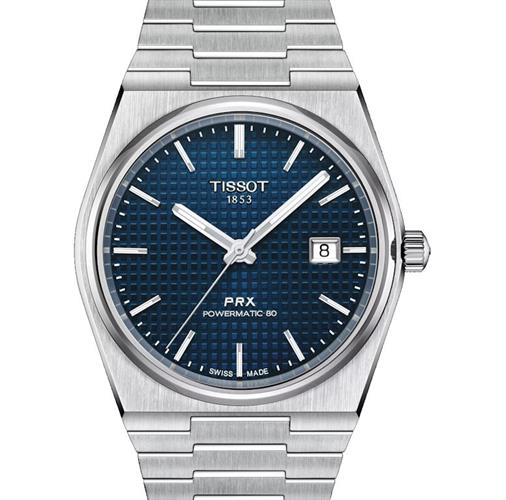 Tissot PRX Powermatic 80 model T137.407.11.041.00. Swiss made automatic movement with date function and up to 80 hour power reserve. Solid stainless steel case and bracelet with a unique tonneau shape. Waffle pattern dial in a stunning gradient blue color. Sapphire crystal. Water resistant to 100 meters.