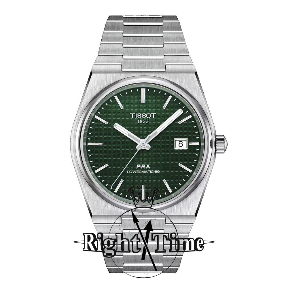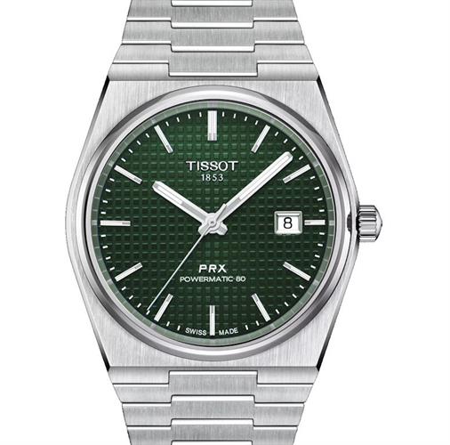 Tissot PRX Powermatic 80 model T137.407.11.091.00. Swiss made automatic movement with date function and up to 80 hour power reserve. Solid stainless steel case and bracelet with a unique tonneau shape. Waffle pattern dial in a gradient green color. Sapphire crystal. Water resistant to 100 meters.
