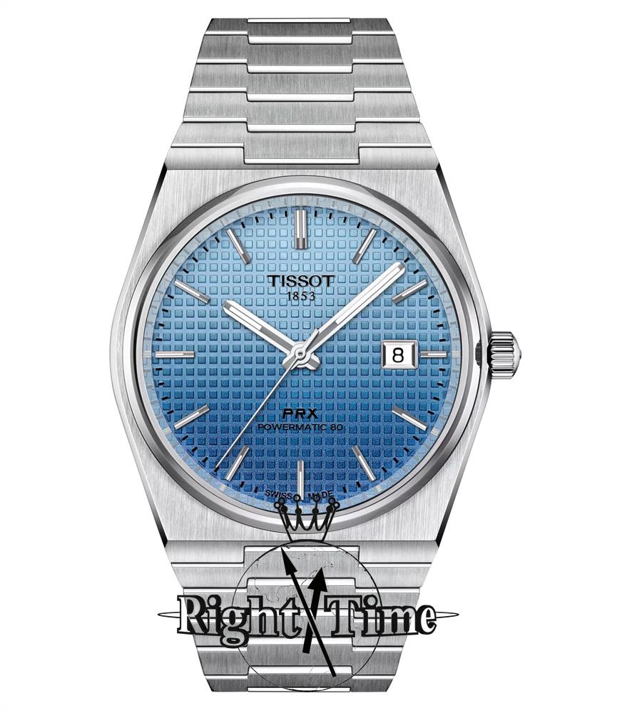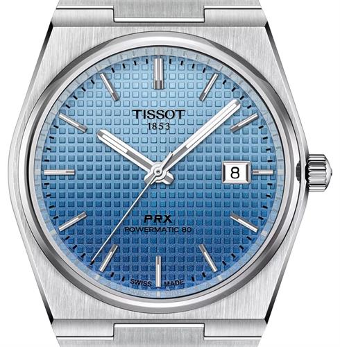 Tissot PRX Powermatic 80 model T137.407.11.351.01. Swiss made automatic movement with date function and up to 80 hour power reserve. Solid stainless steel case and bracelet with a unique tonneau shape. Waffle pattern dial in a stunning gradient ice blue color. Sapphire crystal. Water resistant to 100 meters.