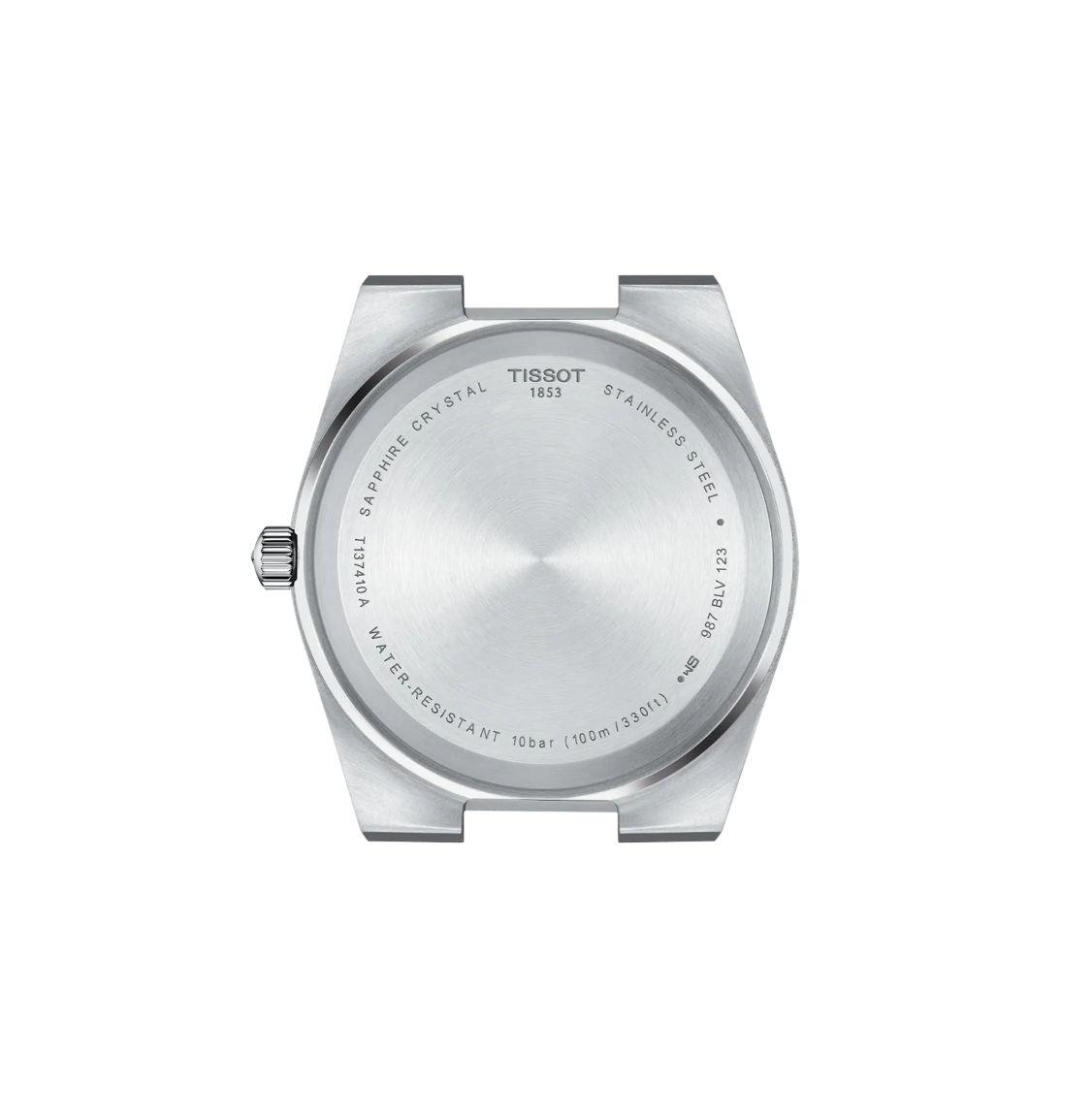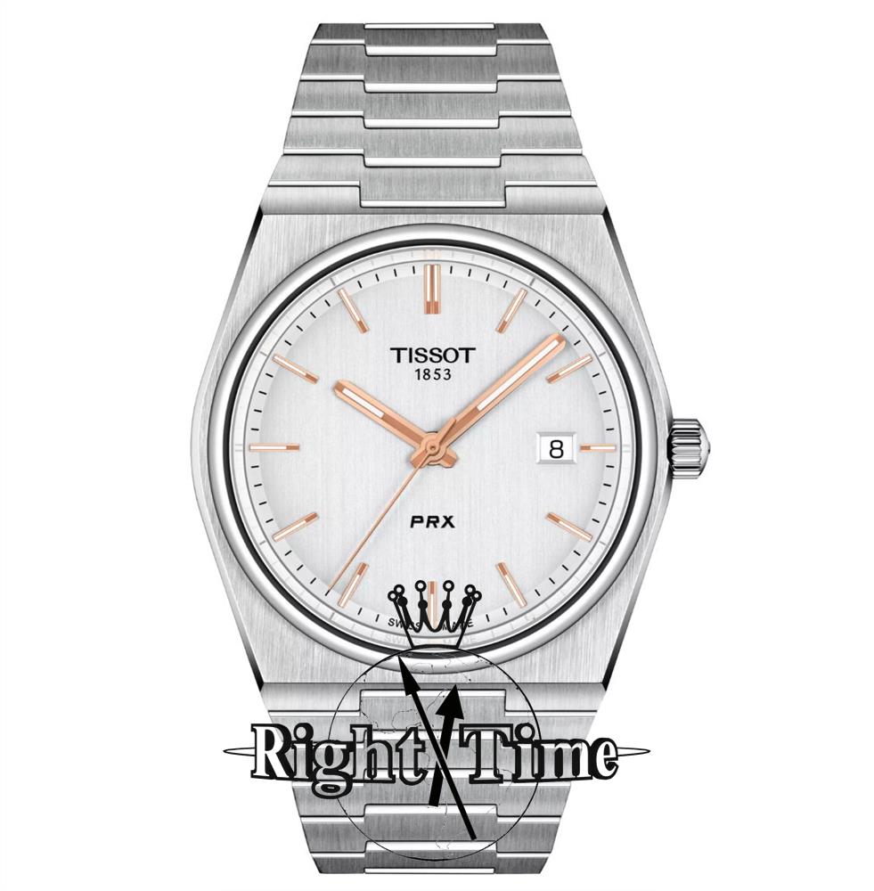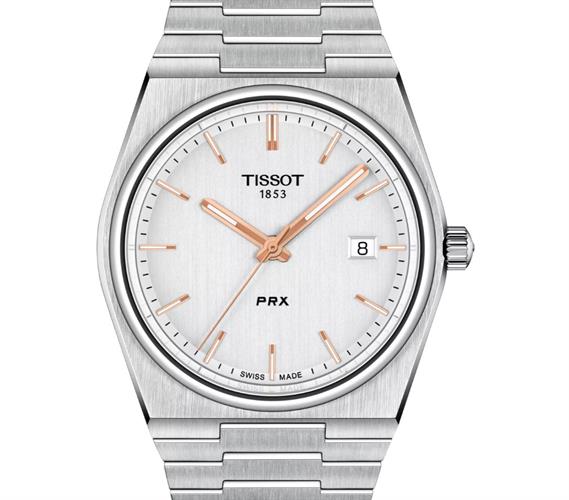 Tissot PRX model T137.410.11.031.00. Swiss made quartz analog movement. Tonneau shaped solid stainless steel case and bracelet. Sapphire crystal. Silver color dial with rose gold tone luminous hands and markers. Water resistant to 100 meters.