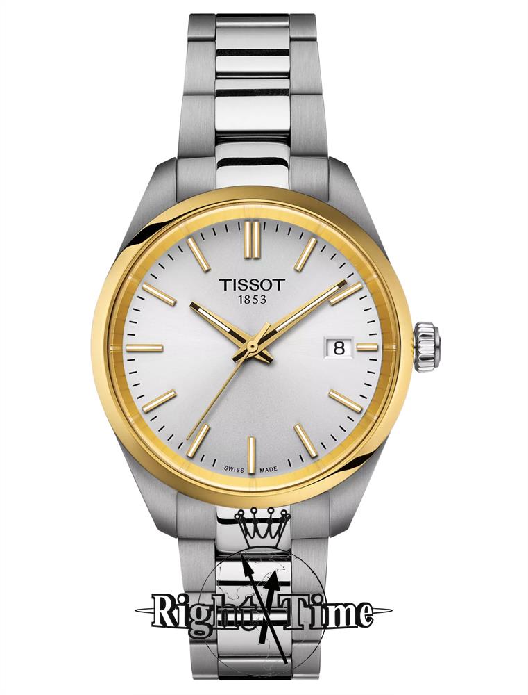 Tissot PR 100 watch model T150.210.21.031.00. Silver color dial gold tone hands and markers. Round stainless steel case/bracelet with gold tone PVD coating. Sapphire crystal. Water resistance 100 meters