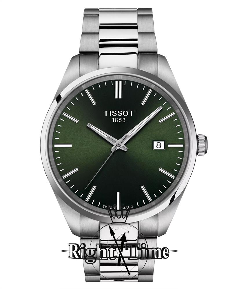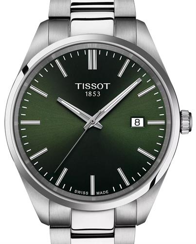 Tissot PR 100 model T150.410.11.091.00. Solid stainless steel case and bracelet. Green dial with steel tone luminous hands and markers. Sapphire crystal. Swiss made quartz analog movement. Water resistant to 100 meters.