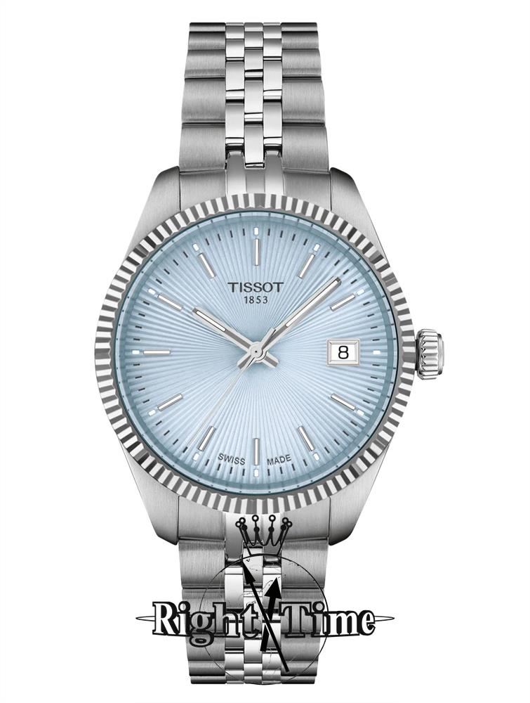 Tissot Ballade model T156.210.11.351.00. Swiss made quartz analog movement. Solid stainless steel case and bracelet. Fixed fluted bezel. Sapphire crystal. Ice blue color dial with steel tone hands and markers. Water resistant to 100 meters.