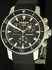 Tissot T19.1.495.51 Seastar Diver 660 quartz chronograph. Perfect for diving, with a black filled unidirectional black filled bezel. Luminous hands and markers contrast nicely to the black dial. Swiss ETA G10.211 quartz chronograph movement with 1/10 second, 60 second, and 30 minute counters. Date display window. This watch is on a rubber strap with a safety clasp and over-the-wetsuit diver extension. Stainless steel case, 200m water resistancy, and sapphire crystal allow for extreme durability.