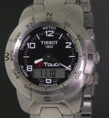 Tissot Touch Multifunction wrist watch. steel case, sapphire crystal, black dial with Arabic numerals, satin finish solid steel watch band. Watch functions activated by pressing on the crown plus touch-sensitive screen. T-Touch functions: Altimeter, Chronograph, Compass, Alarm, Thermometer, Barometer, Date and Time.