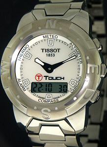 Tissot T-Touch with highly polished titanium case. Gorgeous White Mother of Pearl dial makes this rugged watch quite lady-like, sponsored by Formula One female champion driver Danica Patrick. Operated by the touch-sensitive screen, this watch has an Altimeter, Barometer, Alarm, Compass, Day, Time, and Chronograph.