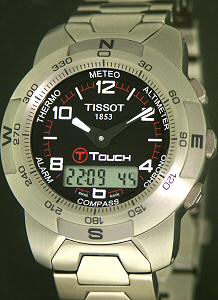 Tissot T-Tactile T-Touch model T33.7.788.51. Black dial with white Arabic numerals, Sapphire crystal with anti-glare coating, titanium case and band. Functions are operated with touch screen and include: Alarm, Altimeter, Barometer, Chronograph, Date and Time, Compass, and Thermometer.