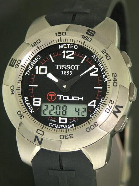 Tissot T-Touch Multi-Function wrist watch. Titanium case, black rubber watch strap, sapphire crystal with anti-glare coating, black dial with white arabic numerals, white outline, luminescent filled, black hands. Watch functions operated by touch-sensitive screen which is activated by the crown. T-Touch functions: Altimeter, Chronograph, Compass, Alarm, Thermometer, Barometer, Date and Time.
