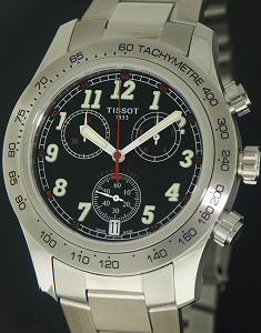 Tissot V8 T36.1.386.52 quartz chronograph watch. Retro classic sports timepiece with tachymetre scale on bezel. Black dial with sharp contrasting luminous Arabic numerals. ETA G10.211 quartz chronograph movement with 1/10 second, 60 second, and 30 minute counters. Sapphire crystal and combination finish stainless steel case and bracelet. Nice big size!