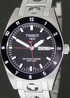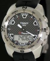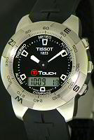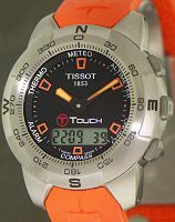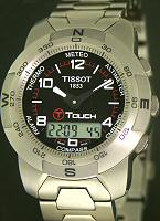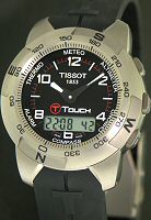 Tissot T-Touch "Expert" 100m water resistant, stainless steel case and band. Altimeter, barometer,compass, 2 alarms, dual time, stopwatch, countdown timer,thermometer. Sapphire crystal, black color dial with Arabic numbers.