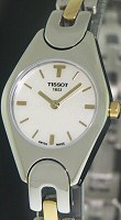 Tissot Stylis-T quartz watch. Stainless steel case with bracelet. White dial with Arabic numerals.