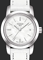 Tissot T033.210.16.111.00 Classic Dream Lady quartz watch. White Mother-of-Pearl dial with date. Very classic look. Round steel case, sapphire crystal, white strap. Powered by Swiss ETA quartz movement