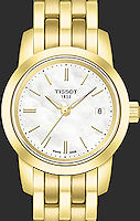 Tissot T033.210.22.111.00 Classic Dream Lady quartz watch. White Mother-of-Pearl dial with date. Very classic look. Round gold plated steel case, sapphire crystal, steel gold plated bracelet. Powered by Swiss ETA quartz movement