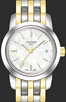 Tissot T033.210.33.111.00 Classic Dream Lady quartz watch. White Mother-of-Pearl dial with date. Very classic look. Round steel case, sapphire crystal, steel bracelet with gold plated accents. Powered by Swiss ETA quartz movement