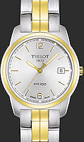 Tissot T049.210.22.037.00 Classic PR100 Lady quartz watch. Silver color dial with date. Round steel case with bracelet and gold tone accents, sapphire crystal. Powered by Swiss ETA quartz movement