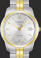 Tissot T049.410.22.037.00 Classic PR100 Steel Mens quartz watch. Silver color dial with date. Round steel case with gold tone accents, sapphire crystal, steel bracelet with gold tone accents. Powered by Swiss ETA quartz movement