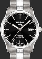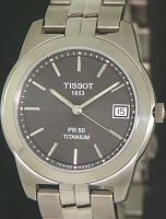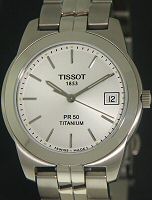 Tissot PR 50 Titanium quartz watch model T34.7.481.31. Sleek finished case and bracelet, combination satin and high polish titanium. Very light and comfortable! Silver dial with silver hands and markers encased by a sapphire crystal.