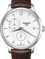 Tissot T063.639.16.037.00 Tradition GMT quartz watch. White color dial with date and second time-zone sub-dial. Round stainless steel case, sapphire crystal, brown leather band. Powered by Swiss ETA quartz movement
