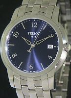 Tissot T97.1.481.42 T-Ring mens quartz watch. Gorgeous foil finish blue dial accented by skeletonized silver color hands, markers, and numerals. This very classic watch uses a Swiss ETA quartz movement, has a date display and a sapphire crystal. The look is completed with a combination high polish and satin finish stainless steel case.