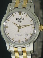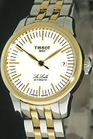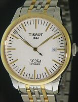 Tissot Le Locle T41.1.483.31 mens automatic watch. ETA 2824-2 Swiss automatic movement. Very dressy execution with a light silver, almost white, dial and gold color hands and markers. Highly polished stainless steel case with gold plated bezel and accents on the band.