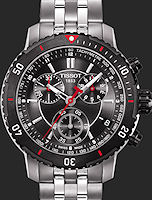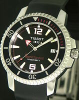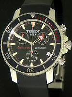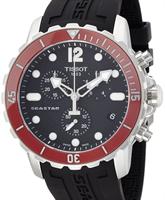 Tissot T-Sport Seastar Diver watch model T066.417.17.057.01. Swiss ETA quartz chronograph movement. Black dial. 300m water resistant. Stainless steel case with unidirectional red divers bezel and black rubber band.