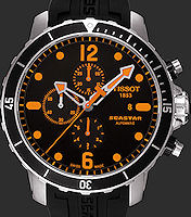 Tissot T-Sport Seastar Diver watch model T066.427.17.057.01. Swiss ETA automatic chronograph movement. Black dial with orange color accents. 300m water resistant. Stainless steel case with unidirectional divers bezel and bracelet.