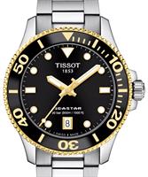 Tissot Seastar 1000 model T120.210.21.051.00. Swiss made quartz analog movement. Solid stainless steel case and bracelet with gold tone PVD coated uni-directional 60 minute bezel. Black dial with gold tone luminous hands and markers. Sapphire crystal. Water resistant to 30bar.
