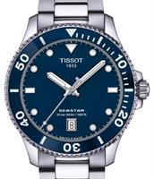 Tissot Seastar 1000 model T120.410.11.041.00. Swiss made quartz analog movement. Solid stainless steel case and bracelet with a uni-directional 60 minute bezel. Blue dial with steel tone luminous hands and markers. Sapphire crystal. Water resistant to 30bar.
