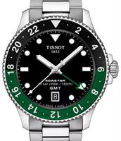 Tissot Seastar 1000 model T120.852.11.051.00. Swiss made quartz analog movement with GMT second time zone function. Solid stainless steel case and bracelet with a bi-directional 24 hour black/green bezel. Black dial with steel tone luminous hands and markers. Sapphire crystal. Water resistant to 30bar.