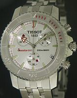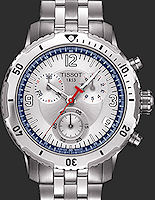 Tissot PRS200 Ice Hockey 2012 T067.417.11.037.01 chronograph quartz watch. Swiss ETA G10.211 quartz chronograph movement with 1/10 second, 60 second, and 30 minute counters. Stainless steel case and band. 0-60 bezel. Silver color dial with blue accents. Sapphire crystal.