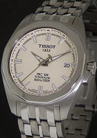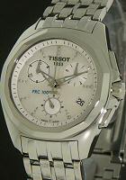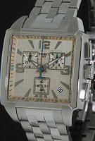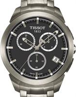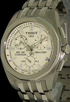 Tissot mens quartz sport-dress chronograph model with ivory color dial, 100m water resistance, polished and satin finished titanium case and bracelet