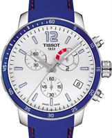 Tissot Quichster Chrono Football watch model T095.449.17.037.00 powered by quartz chronograph movement. 42mm stainless steel case with blur bezel. White dial. Blue silicone band