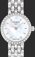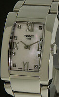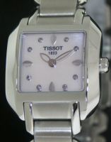 Ladies Tissot from the T-Waive collection, all stainless steel case and bracelet, sapphire crystal, mother-of-pearl dial with diamond indexes.