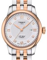 Tissot Le Locle ladies model T006.207.22.036.00. Swiss made automatic movement. Solid stainless steel case and bracelet with rose gold PVD plating. Silver Roman dial with genuine diamond markers and blued hands. Sapphire crystal.