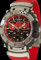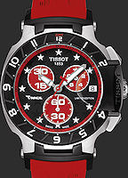 In honor of Tissot brand ambassador Nicky Hayden the MotoGP World Champion. This is the 2011 Limited Edition Nicky Hayden T-Race quartz chronograph. Stainless Steel case with a steel black PVD plated bezel. Black and red dial, sapphire crystal with date magnifier. Red rubber starp